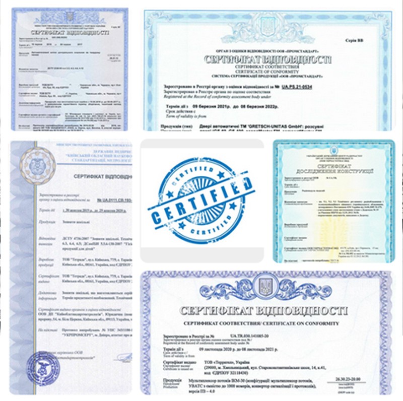 Сертифікат відповідності – документ, що виданий для підтвердження того, що продукція, система якості, система управління якістю, система управління довкіллям, персонал відповідає встановленим вимогам конкретного стандарту чи іншого нормативного документу, визначеного чинним законодавством.
